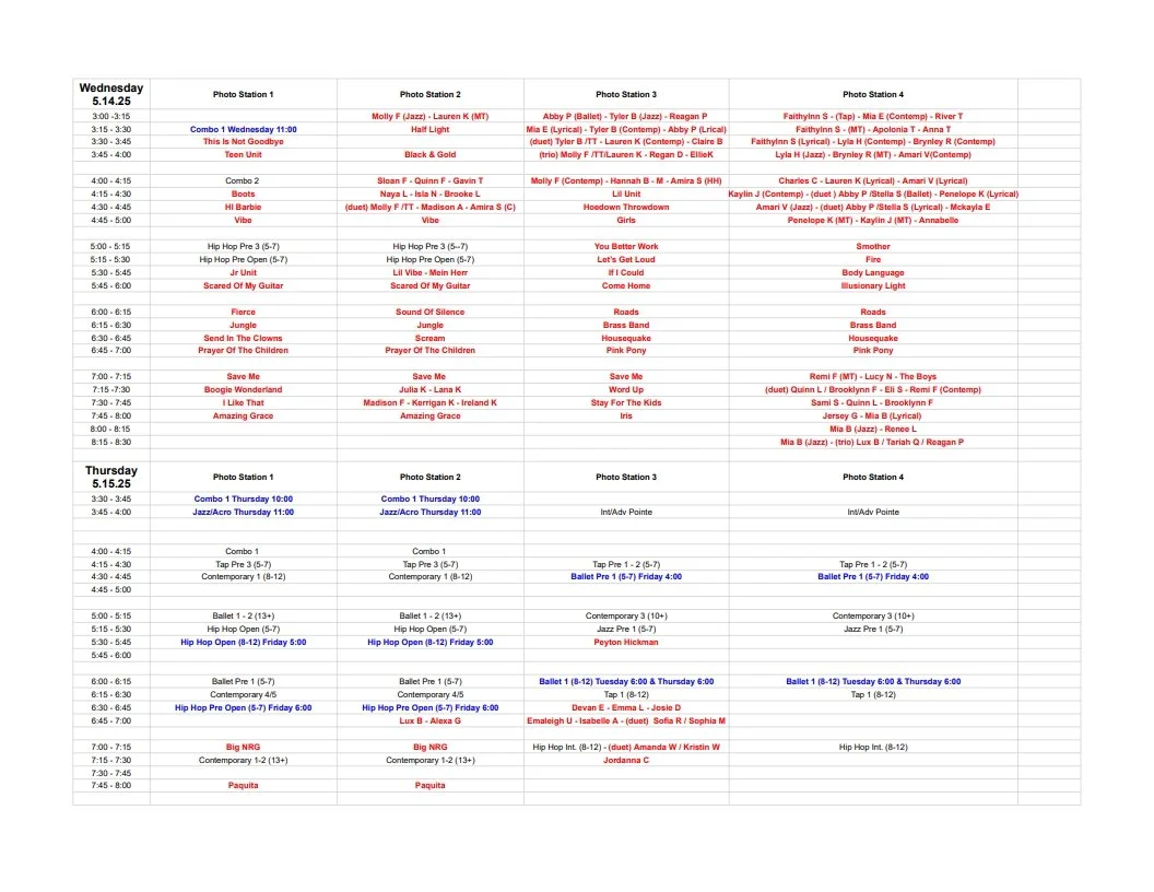 We’ve done our best to schedule pictures as close to your regular class time as possible. During this time, dancers will also run through their recital choreography in costume. This will serve as a dress rehearsal for all classes, except Lil DD and Pre-Level dancers, whose dress rehearsal will take place on Friday, June 20th.